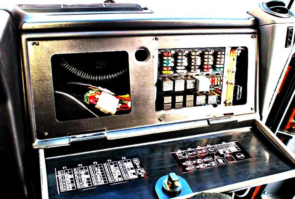 Реле и предохранители расположены в кабине на монтажном блоке справа от панели приборов под съемной крышкой. Порядковый номер предохранителей в перечне соответствует их нумерации на блоках.