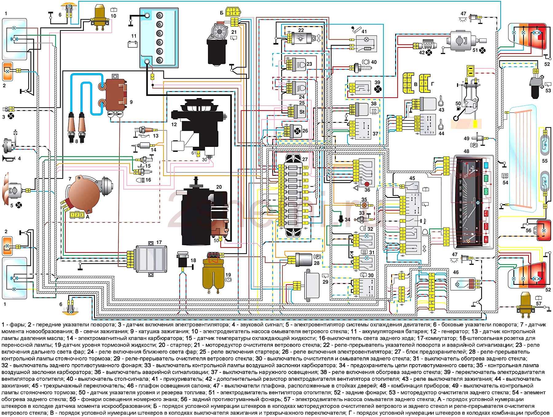 1 – повторитель поворотника; 2 – поворотник передний; 3 – фара; 4 – эл. мотор вентилятора с-мы охлаждения; 5 – сигнал; 6 – датчик включения вентилятора; 7 – эл. мотор насоса омыва; 8 – датчик момента подачи искры; 9 – АКБ; 10 – стартер; 11 – коммутатор; 12 – свечи; 13 – катушка; 14 – генератор; 15 – температурный датчик; 16 – датчик давления масла; 17 – розетка на 12 В; 18 – реле мех-ма стеклоочистителя; 19 – датчик уровня тормозной ж-сти; 20 – выключатель стоп-сигнала; 21 – эл. мотор стеклоочистителя; 22 – эл. магнитный клапан карбюратора; 23 – выключатель фонаря заднего хода; 24 – реле стартера; 25 – реле включения ближнего света; 26 – реле включения дальнего света; 27 – реле аварийного сигнала; 28 – прикуриватель; 29 – переключатель эл. мотора печки; 30 – доп. резистор эл. двигателя печки; 31 – выключатель освещения; 32 – предохранительный блок; 33 – предохранитель цепи питания ПТФ; 34 – реле включения обогревателя заднего стекла; 35 – реле включения эл. мотора вентилятора с-мы охлаждения; 36 – реле-прерыватель контрольки стояночного тормоза; 37 – выключатель обогревателя и омывателя заднего стекла; 38 – выключатель обогревателя заднего стекла; 39 – выключатель заднего ПТФ; 40 – контролька подсоса карбюратора; 41 – выключатель аварийной сигнализации; 42 – замок зажигания; 43 – реле зажигания; 44 – эл. мотор печки; 45 – топливный датчик; 46 – выключатель плафона; 47 – приборная доска; 48 – переключатель очистителя лобового стекла; 49 – выключатель насоса омывателя стекла; 50 – выключатель сигнала; 51 – переключатель света; 52 – переключатель поворотников; 53 – выключатель сигнальной лампы стоп-сигнала; 54 – салонный плафон; 55 – выключатель контрольки подсоса карбюратора; 56 – эл. мотор омывателя заднего стекла.