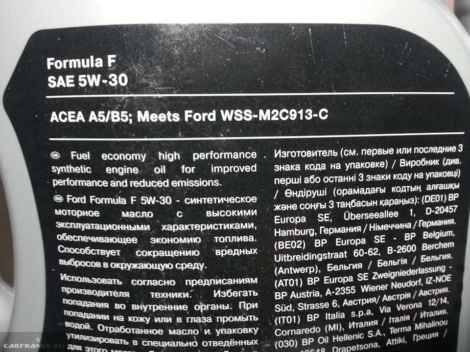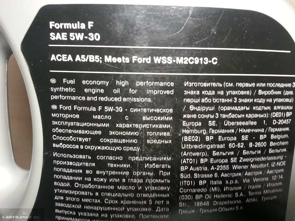 На самом деле совсем необязательно использовать именно Ford Formula F 5W-30. Вполне хватит того, чтобы выбранное масло отвечало фордовским стандартам Форд WSS-М2С913-A и WSS-М2С913-В, тем более, что по понятным причинам компания Форд никаких масел не производит и использует продукты сторонних производителей.