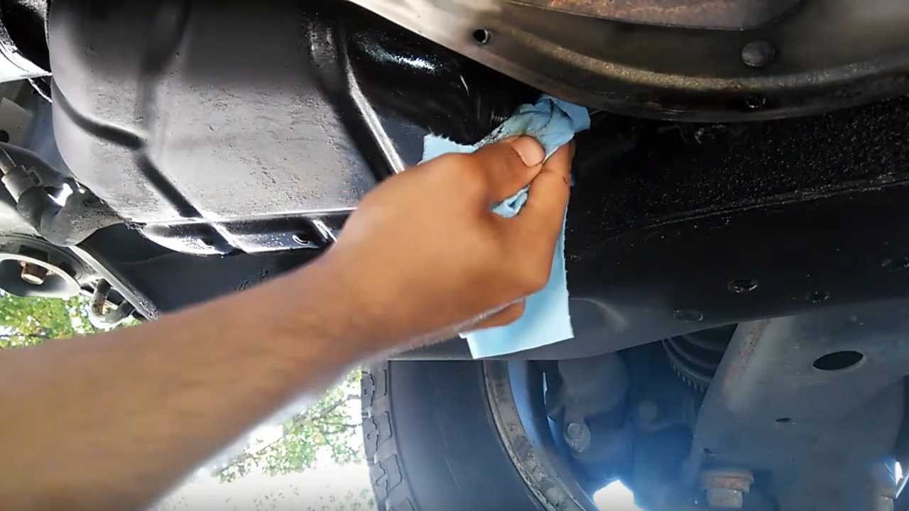 8. Очищаем потеки масла возле сливного отверстия ветошью.