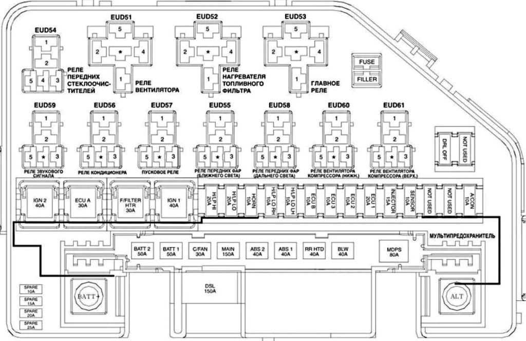 | ALT | 125A Генератор, предохранитель (ABS 2 40A, ABS 1 40A, RR HTD 40A, BLOWER1 40A, MDPS 80A, A / CON 10A) |