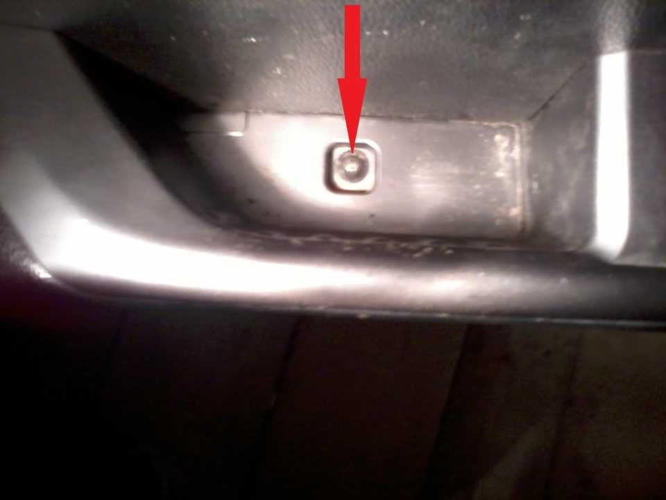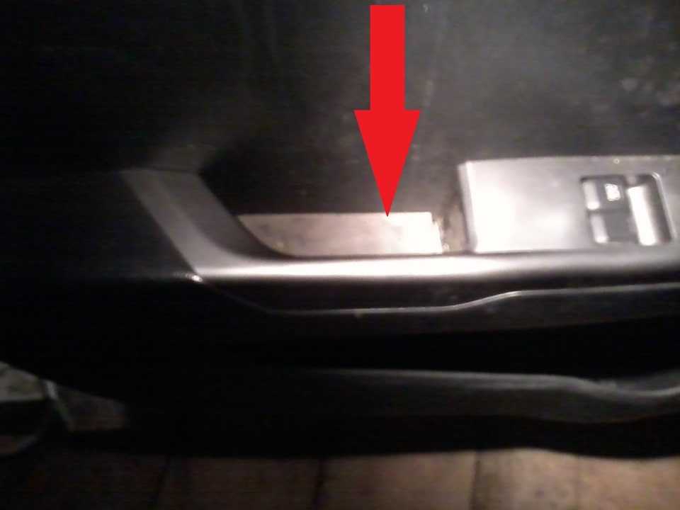 - Для начала, необходимо открутить два скрытых самореза, один из которых закрыт пластиковой накладкой у ручки двери, а второй, резиновым «ковриком» на дне углубления для мелочи, рядом с кнопкой стеклоподъёмника.
