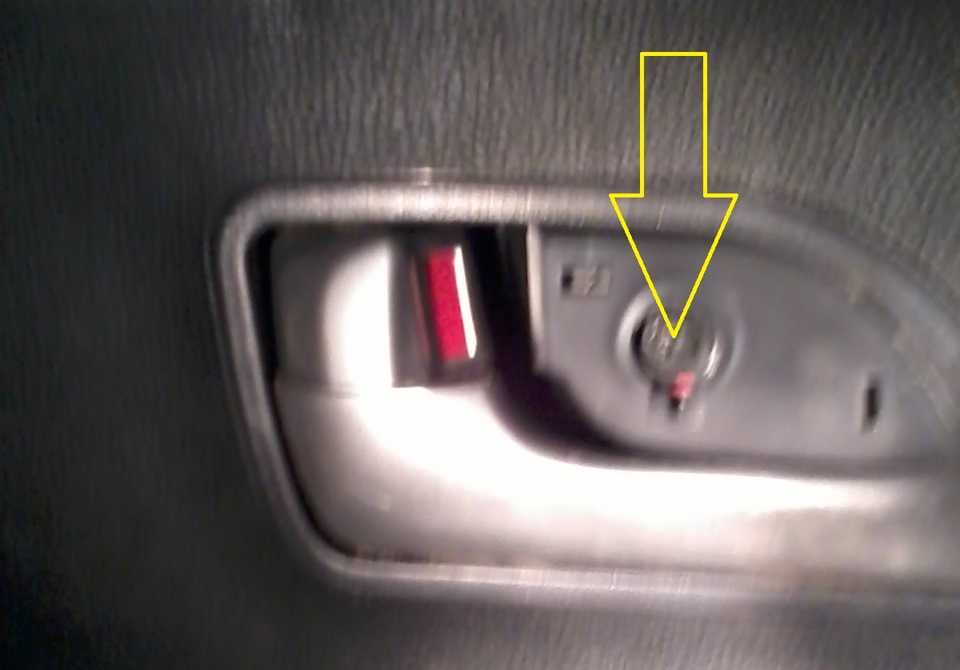 Этим крючком я смог подцепить накладку, просунув крючок в маленькую щель у кнопки блокировки двери (место указано стрелкой).