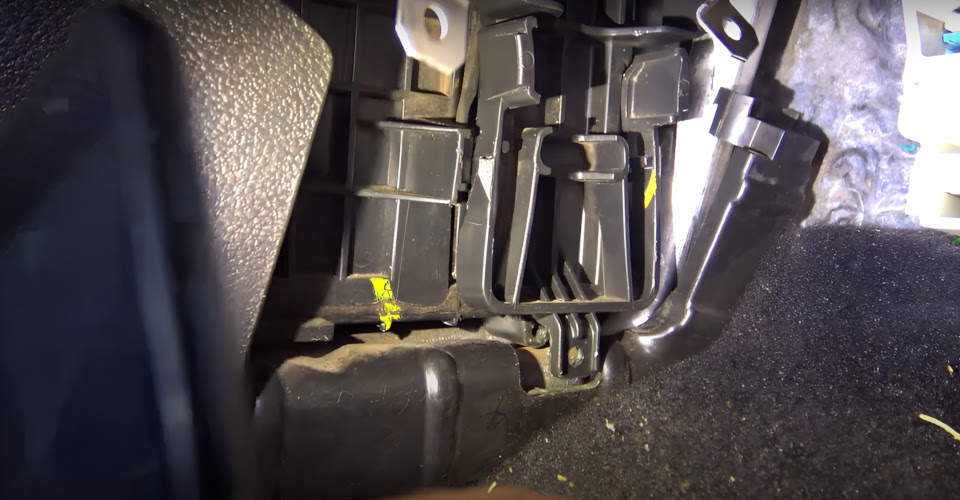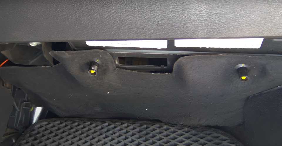 Картридж находится под бардачком слева, на боковой поверхности центральной консоли. Сначала советуем убрать резиновый коврик, он будет мешать получению доступа. Первое препятствие на пути — войлочная обшивка, которая закрывает пространство под бардачком. Вот как она выглядит: