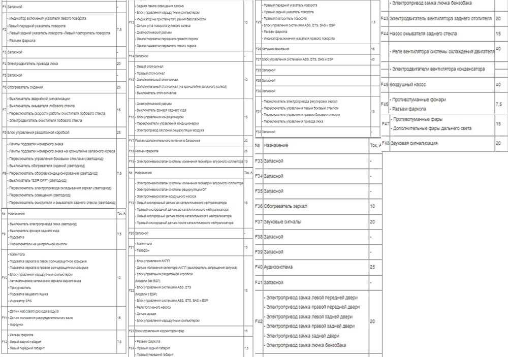 | F8 | (10А) Реле обогревателя заднего стекла — если есть, центральный замок, блок управления сигналом центрального замка, блок управления системой освещения в дневное время — если есть, выключатель запрещения запуска («PVN»), фонари заднего хода |