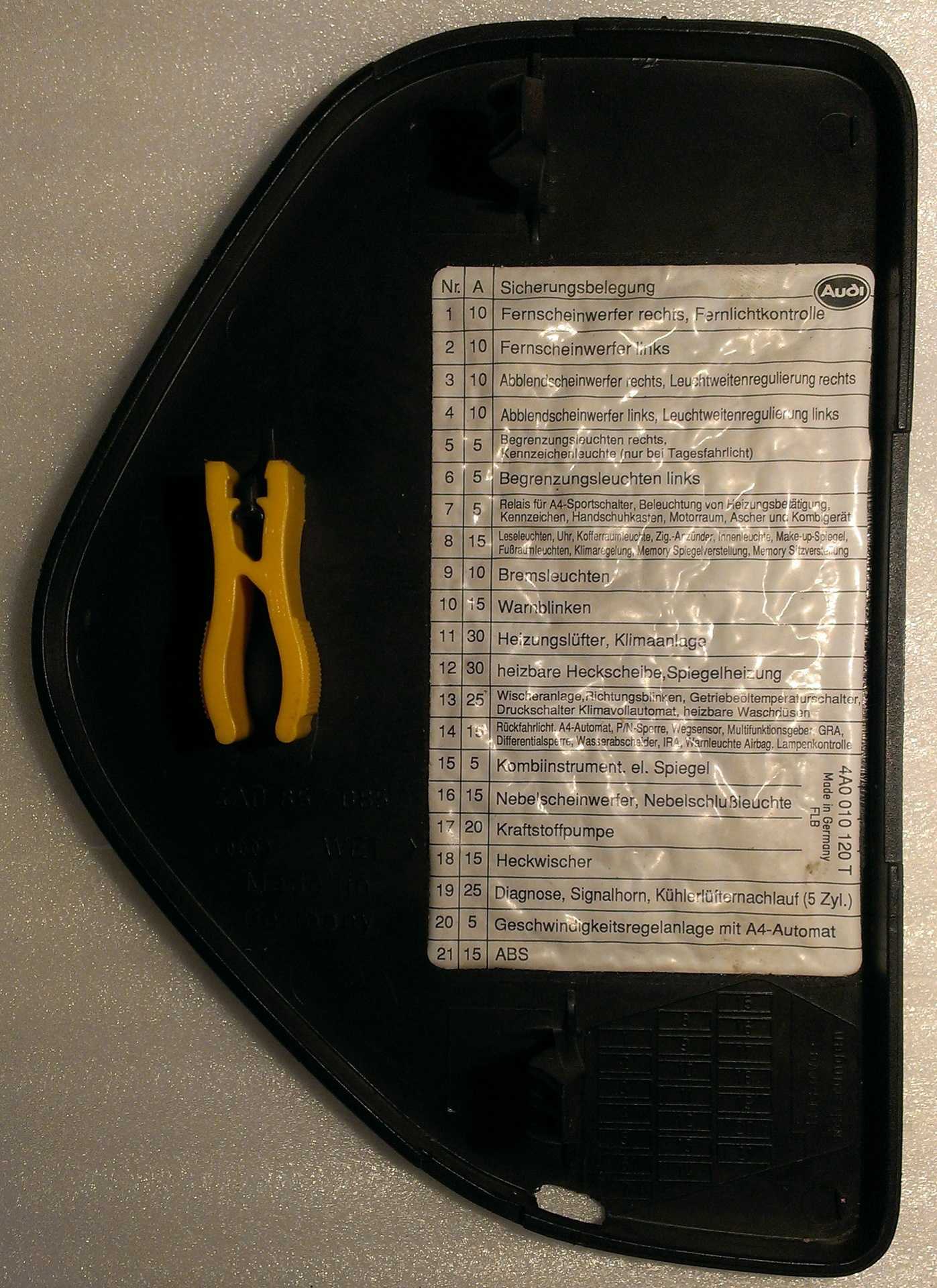 В автомобиле Audi 100 С3 предохранители под панелью приборов расположены на панели приборов, слева от руля. Чтобы получить доступ к ним, необходимо сначала снять крышку панели приборов.