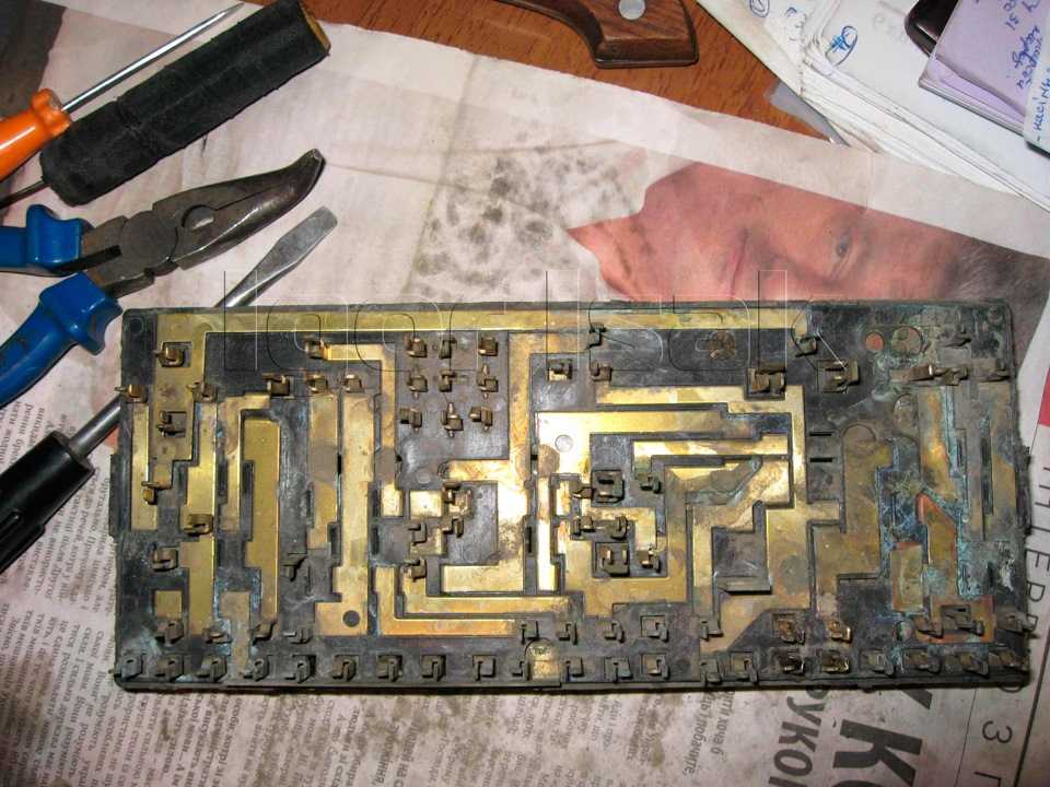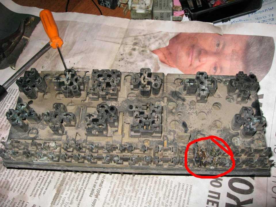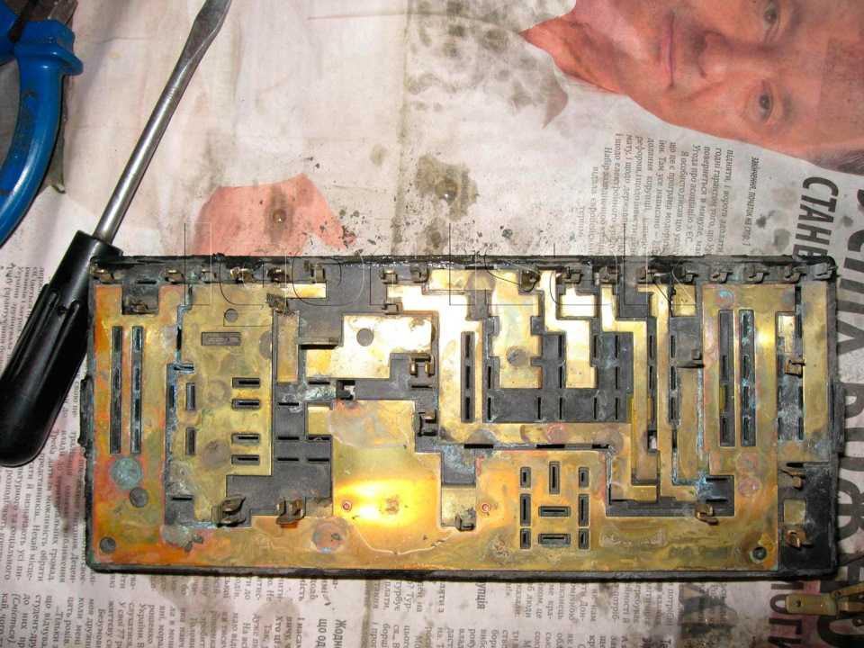 Отсоединил все колодки и провода, вытянул БП (блок Предохранителей)Короб как бы склеен и наглухо. Пришлось соврать пальцы.но все таки разорвать этот корпус пополам.Времени это заняло — минут 20.не менее.Далее: начал разбирать сами панельки, ибо их там 4 кажется штуки, предох что залип.сплавил рядом еще один, его не было видно сверху.Вот отковыривать контакты чтоб снять первый этаж БП — это настоящий гемор! Жарился где-то минут 40…Далее когда осилил, алгоритм работ был такой:- фоткаю, снимаю все металлические дорожки в одну коробку…снимаю пластмассовую панель-этаж- …то же самое…пока не снял все панели.Помыл в воде, протер контакты щеткой по металлу, высушил, и начал по фото в обратной последовательности собирать.
