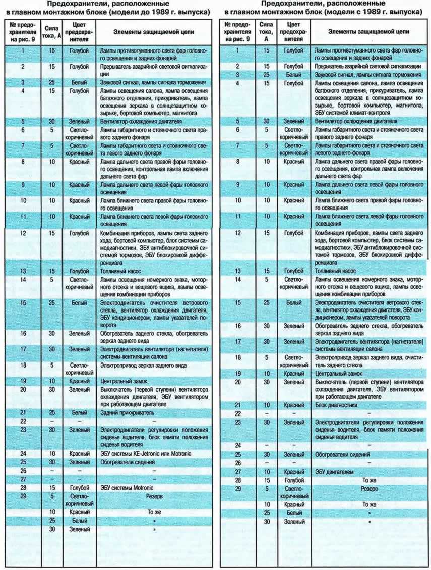 Места расположения и идентификация предохранителей (Audi-80/ 90, 80/ 90 Quattro и Купе, начиная с моделей 1989 г.в.)