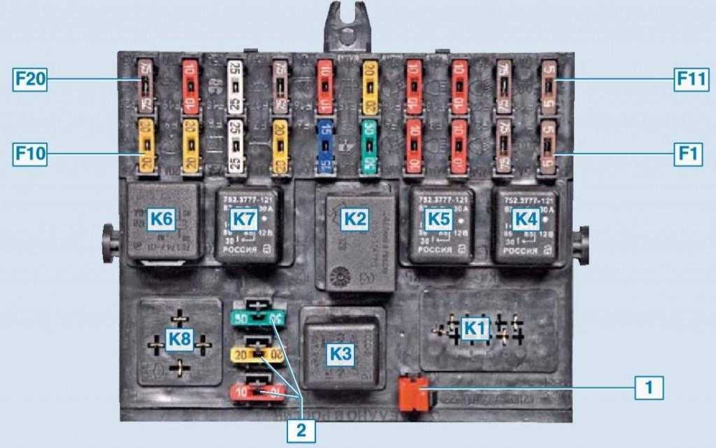 Схема расположения элементов в монтажном блоке Нива Шевроле.