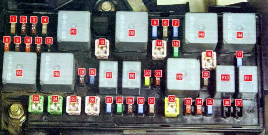 Данный блок находится под капотом автомобиля. Внутри него встроено несколько предохранителей и реле, схема расположения которых приводится в изображении ниже. Также после фото находится таблица с расшифровкой основных элементов агрегата.