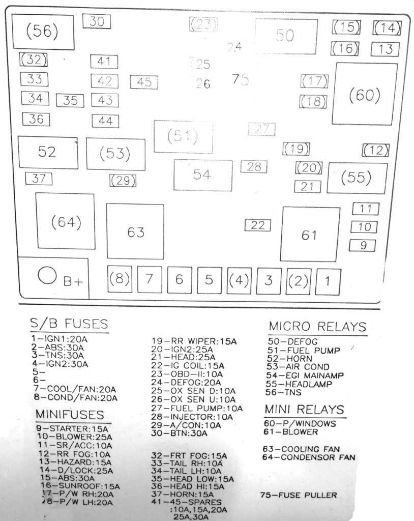 F1- Регулятор подсветки приборов F2-Датчик кислорода (лямда зонд), клапан бензобака, спидометр. F3- Питание форсунок двигателя. F4- Кнопка кондиционера F5-Прикуриватель F6-Питание ламп панели приборов F7-Магнитолла постоянное питание F8-Диагностический разъём Клемма 16 F9-Питание панели приборов F10-Задний стеклоочиститель F11-Передний стеклоочиститель F12-Реле ближнего и дальнего света (обмотка) F13-Подушка безопастности F14-Магнитолла (управление АСС) F15-Зеркала заднего вида F16-Подогрев сидений F17-Питание блока управления двигателем (1й контакт) F18-Модуль сигнализации и управления замками F19-Стеклоподъёмники F20- Питание модуля люка (мотор) F21-Кнопка выключения (смотрите блок сигнализации, я незнаю где и для чего она) F22-Внутреннее освещение, лампа подсветки в двери, индикатор открытия двери F23-Кнопка управления люком F24-Питание звукового сигнала (Гуделки) F25-Заслонка рециркуляции воздуха в салоне (кнопка и мотор) F26-Реле кондиционера (обмотка) F27-Зеркала заднего вида F28-АМ1 (через замок зажигания идёт на линии АСС и IG1) F29-АМ2 (через замок зажигания идёт на линию IG2 и обмотку реле стартера) F30-Резервный