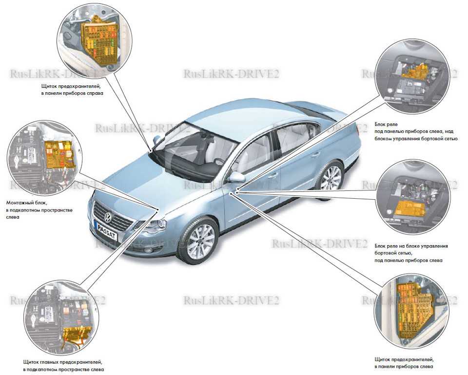Кроме блоков защитных деталей, на Passat присутствуют модули реле и прерывателей, которые обеспечивают надежную работу бортовой электросети. Места установки: