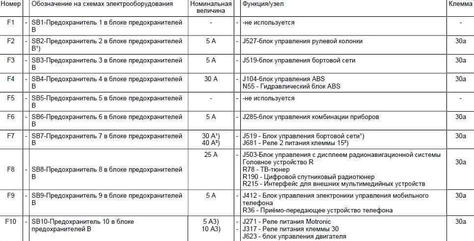 Расшифровка по предохранителям в Фольксваген Тигуан