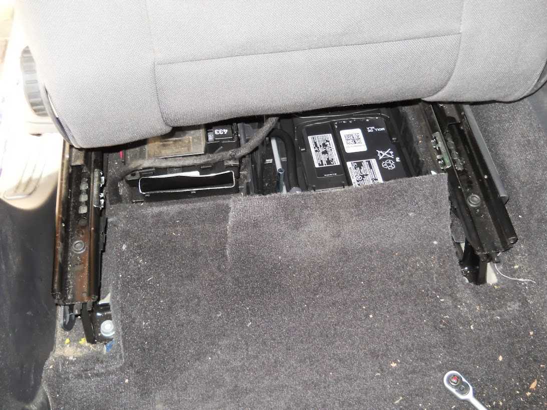 Опускаем сидение вниз полностью, отодвигаем назад до конца и наклоняем назад, видим крышку аккумулятора