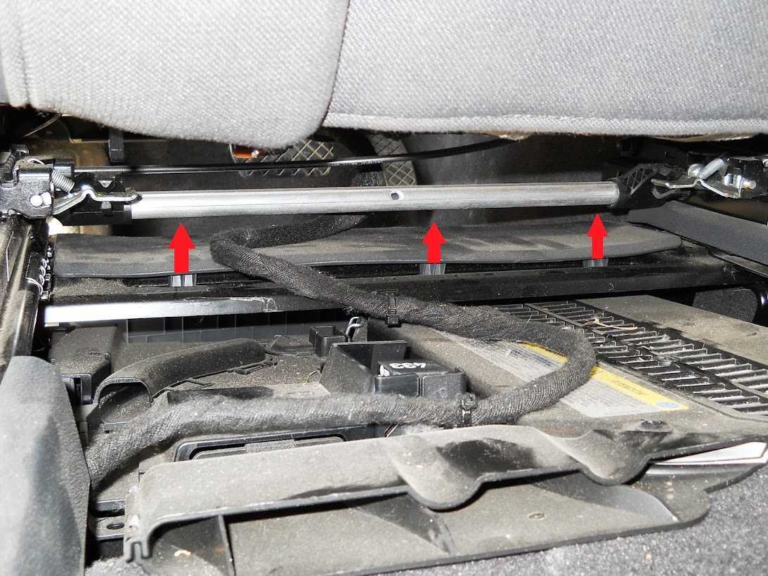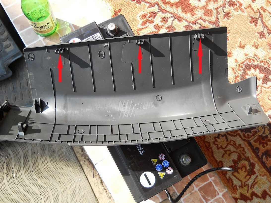Снимаем пластиковую защиту под передним сидением, для этого тянем нижний край от пола вперед, отщелкиваем защелки