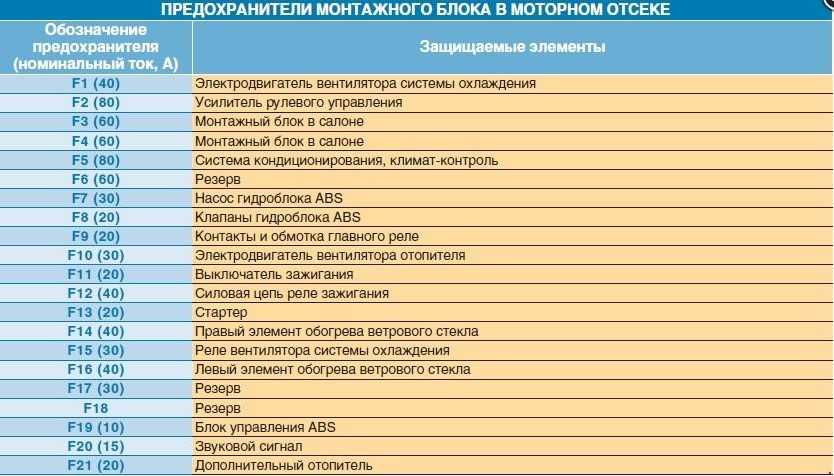 Номер предохранителя Номинальный ток, А Цвет Защищаемые цепи F30 10 Красноватый Выключатель внешнего освещения F31 15 Голубий Магнитола F32 15 Голубий Указатели поворота F33 20 Желтоватый Сигнал звука, электропривод регулировки фронтального сидения F34. Резерв F35 7,5 Карий Лампы освещения салона, электропривод внешних зеркал заднего вида F36 7,5 Карий Электрические блоки управления, композиция устройств F37 25 Белоснежный Электростеклоподъемники дверей с левой стороны F38 25 Белоснежный Электростеклоподъемники дверей с правой стороны F39. Резерв F40 10 Красноватый Фонарь заднего хода F41 7,5 Карий Магнитола (дополнительный) F42 15 Голубий Задние габариты (лампы сигнала торможения) F43 15 Голубий Электростеклоподъемники, очиститель стекла двери задка F44 20 Желтоватый Противотуманки и фонари F45 7,5 Карий Система кондиционирования воздуха, рециркуляция воздуха F46 7,5 Карий Блок управления Abs F47 15 Голубий Прикуриватель