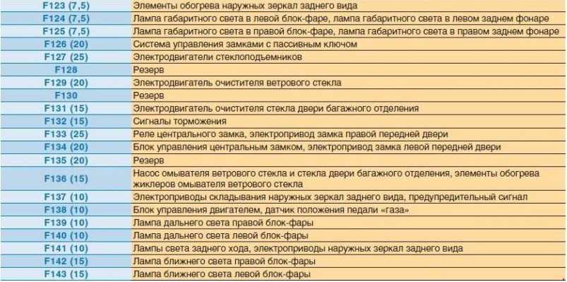 F30 – 10 – Красный – Выключатель наружного освещения F31 – 15 – Синий – Магнитола F32 – 15 – Синий – Указатели поворота F33 – 20 – Желтый – Звуковой сигнал, электропривод регулировки переднего сиденья F34 – 20 – Желтый – Не нашел, что это) Где то пишут что это часы, но по картинке не похоже. F35 – 7,5 – Коричневый – Лампы освещения салона, электропривод наружных зеркал заднего вида F36 – 7,5 – Коричневый – Электронные блоки управления, комбинация приборов F37 – 25 – Белый – Электро стеклоподъемники дверей с левой стороны F38 – 25 – Белый – Электро стеклоподъемники дверей с правой стороны F39 – 15 – Синий – Регулировка сидений F40 – 10 – Красный – Фонарь заднего хода F41 – 7,5 – Коричневый – Магнитола (дополнительный) F42 – 15 – Синий – Задние фонари (лампы сигнала торможения) F43 – 15 – Синий – Электро стеклоподъемники, очиститель стекла двери задка F44 – 20 – Желтый – Противотуманные фары и фонари F45 – 7,5 – Коричневый – Система кондиционирования воздуха, рециркуляция воздуха F46 – 7,5 – Коричневый – Блок управления АБС F47 – 15 – Синий – Прикуриватель F48 – 10 – Красный – Соединительная колодка диагностического разъема F49 – 25 – Белый – Обогрев заднего стекла/стекла двери задка F50 – 7,5 – Коричневый – Обогрев наружных зеркал заднего вида F51 – Не занято F52 – 15 – Синий – Подогрев передних сидений F53 – 10 – Красный – Фонарь заднего хода, обогрев форсунок стеклоомывателя F54 – Не занято F55 – 25 – Белый – Электро стеклоподъемники передних дверей F56 – 20 – Желтый – Очиститель ветрового стекла F57 – 7,5 – Коричневый – Лампы габаритного света (правая сторона) F58 – 7,5 – Коричневый – Лампы габаритного света (левая сторона) F59 – 10 – Красный – Выключатель наружного освещения F60 – 7,5 – Коричневый – Блок управления подушек безопасности F61 – 7,5 – Коричневый – Электронные блоки, комбинация приборов F62 – 7,5 – Коричневый – Фонари освещения номерного знака F63 – 20 – Желтый – Центральный замок