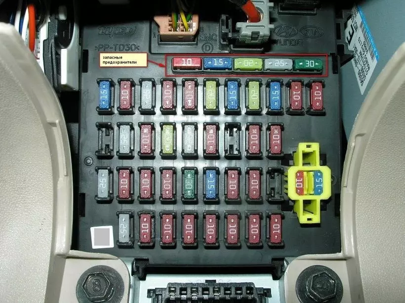 Расположение предохранителей на монтажном блоке, который находится под капотом Элантры: