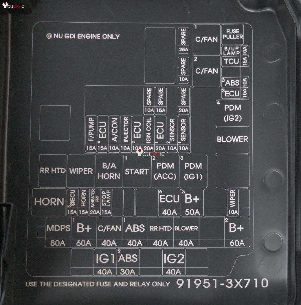 - Откройте блок предохранителей вашего Hyundai Elantra, он находится рядом с аккумулятором под пластиковой крышкой.