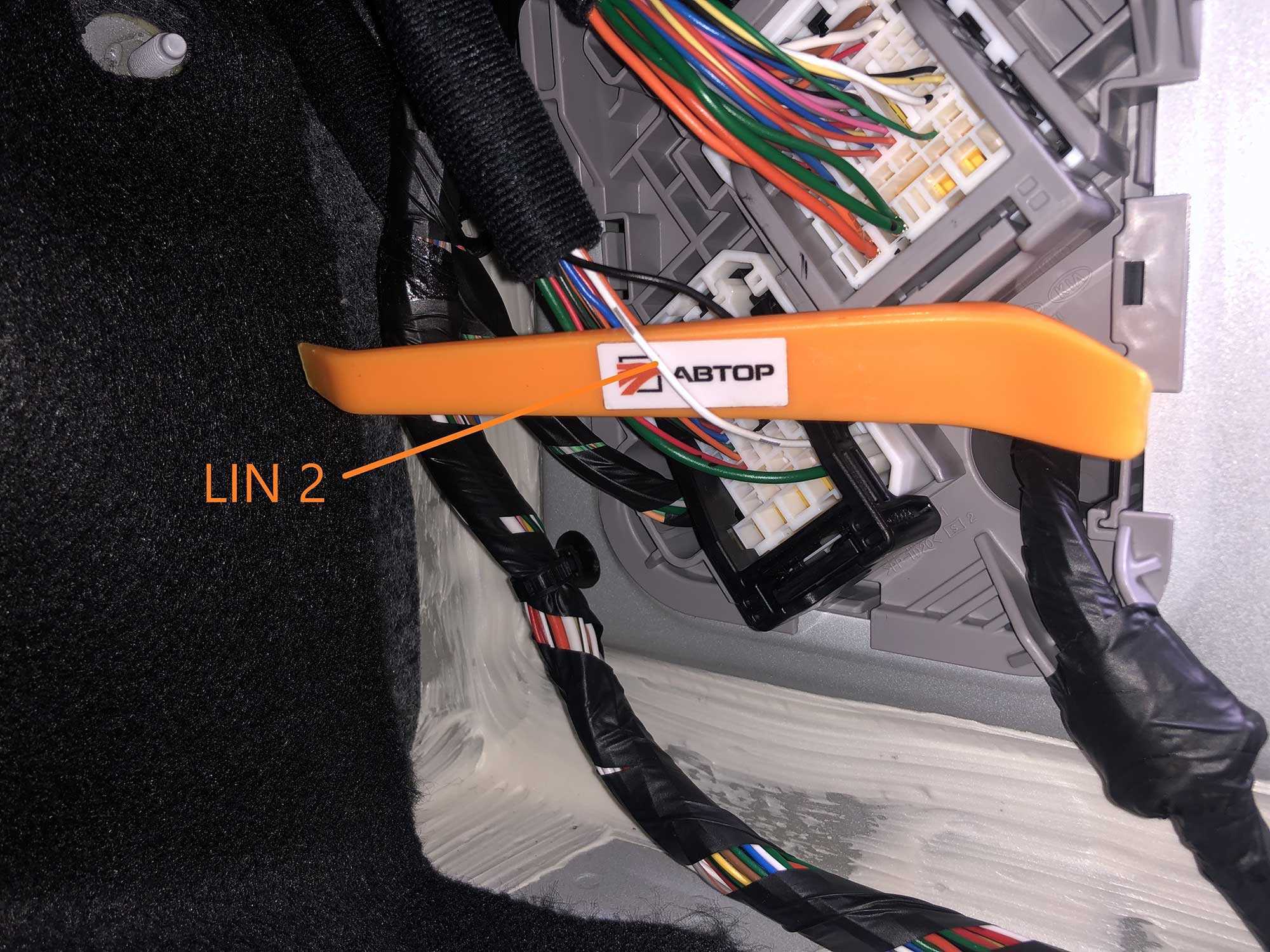 Провод LIN2 подключается в разъеме с черной защелкой за правой кик-панелью, в разрыв белого провода в сторону жгута проводов.
