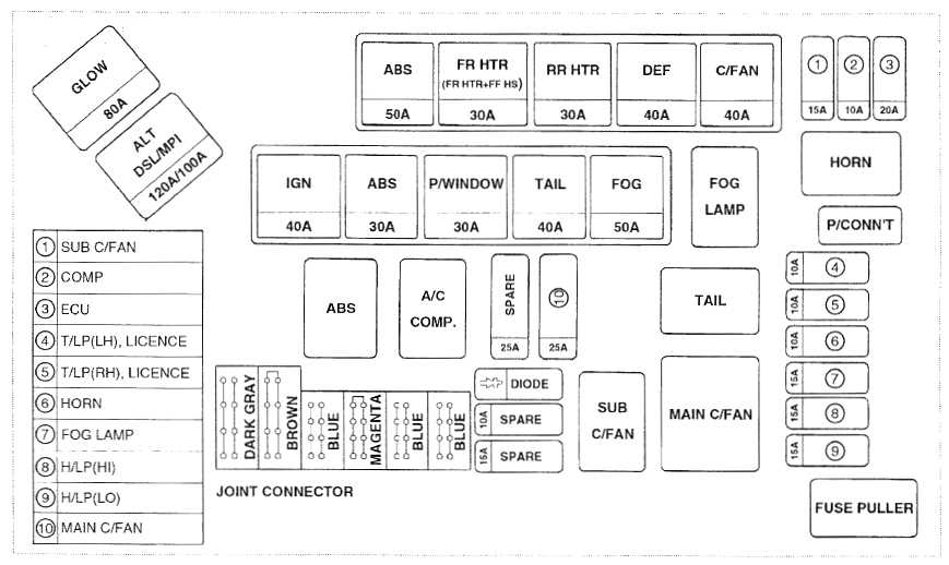 | ECU | 10А Датчик скорости автомобиля, ECM, датчик воздушного потока (D4CB), топливный насос (D4BH), TCM, датчик предупреждения о топливном фильтре |