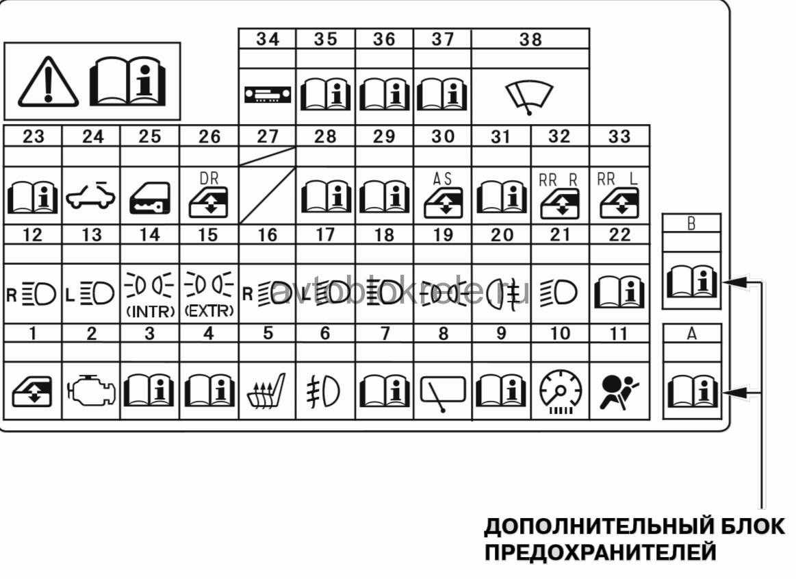 На быстросъемной крышке имеются обозначения основных предохранителей в виде пиктограмм. Пиктограммы в виде справочника с буквой «i» обозначают, что для точной расшифровки назначения предохранителей, установленных на данной позиции, следует воспользоваться техническим описанием данной модели автомобиля.