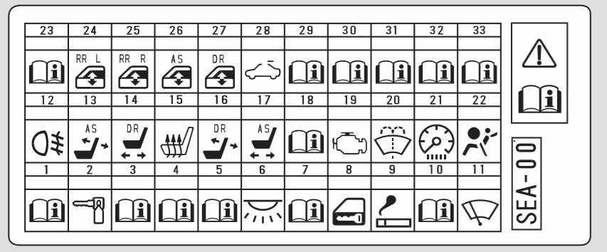 На быстросъемной крышке имеются обозначения основных предохранителей в виде пиктограмм. Пиктограммы в виде справочника с буквой «i» обозначают, что для точной расшифровки назначения предохранителей, установленных на данной позиции, следует воспользоваться техническим описанием данной модели автомобиля.