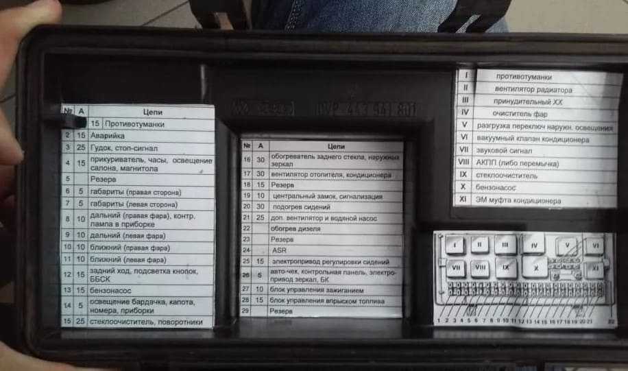 Перечень задействованных предохранителей находится на внутренней стороне крышки ящика предохранителей.