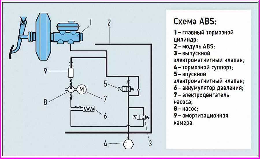 - Электронный блок управления (ЭБУ): анализирует данные от датчиков и определяет, когда колесо начинает тормозить быстрее, чем автомобиль (то есть находится на грани блокировки).