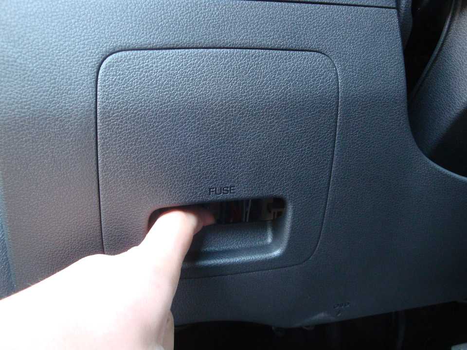 В салоне hyunai tucson, предохранители находятся прямо у левого колена водителя. Снять крышку довольно легко, вытягиваем пальцами за защелку:
