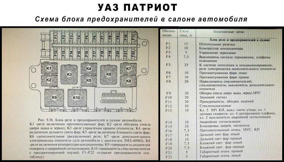 Данный материал позволяет быстро выяснить назначение плавких предохранителей монтажного блока, что зачастую необходимо, когда не работает тот или иной узел на внедорожнике УАЗ Патриот. Поэтому теперь вы сможете быстро и без проблем отыскать неисправность и устранить ее, главное, чтобы в бардачке всегда имелся комплект запасных плавких изделий для монтажного блока.