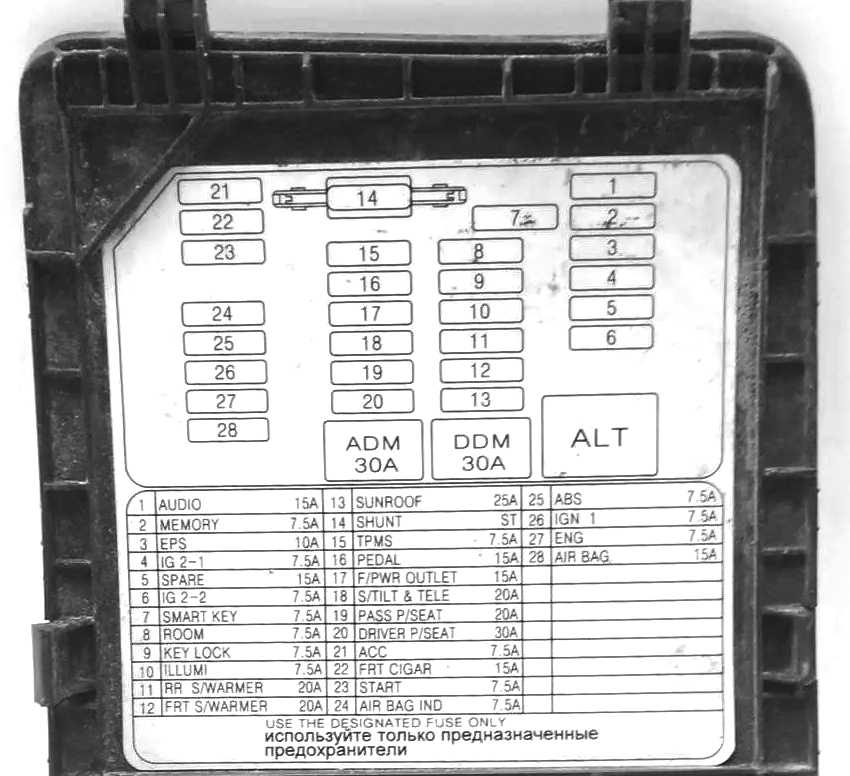 Внутри крышек панели предохранителей / реле вы можете найти этикетку предохранителя / реле с описанием названия и емкости предохранителя / реле.