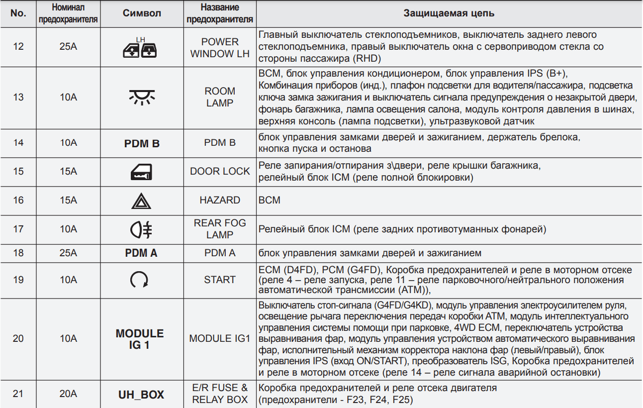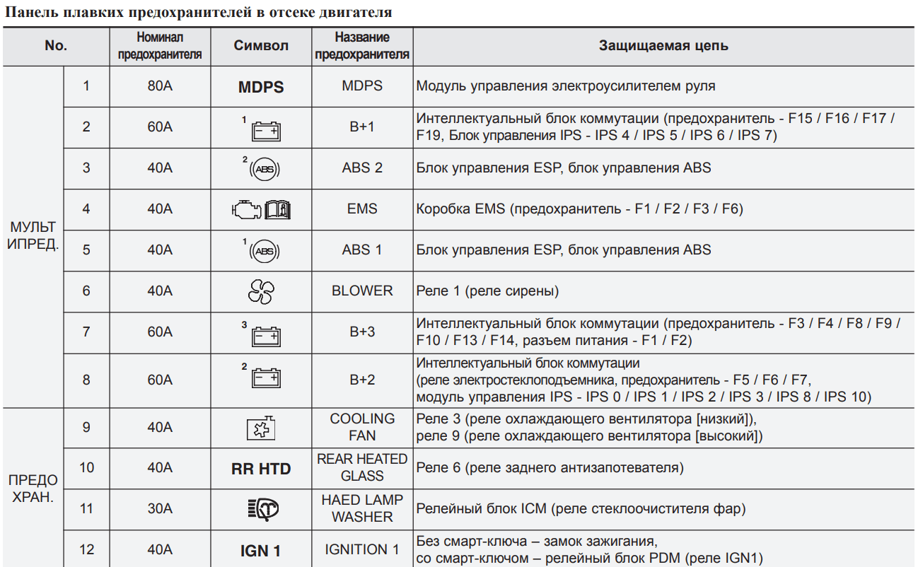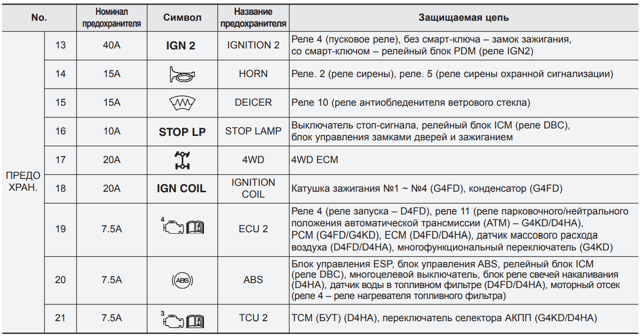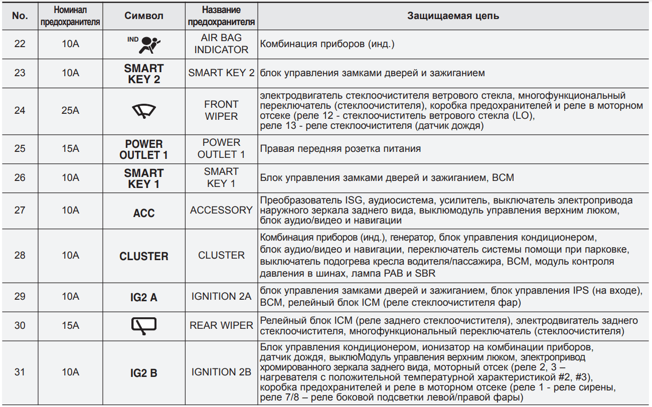 Также ниже представлена таблица, где отмечены основные предохранители, отвечающие за работоспособность наиболее важных функций автомобиля.