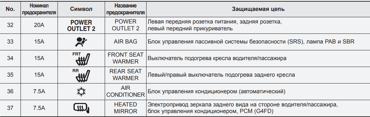- F37 – ЭБУ программного комплекса кондиционирования, привод внешних зеркал (7,5А).