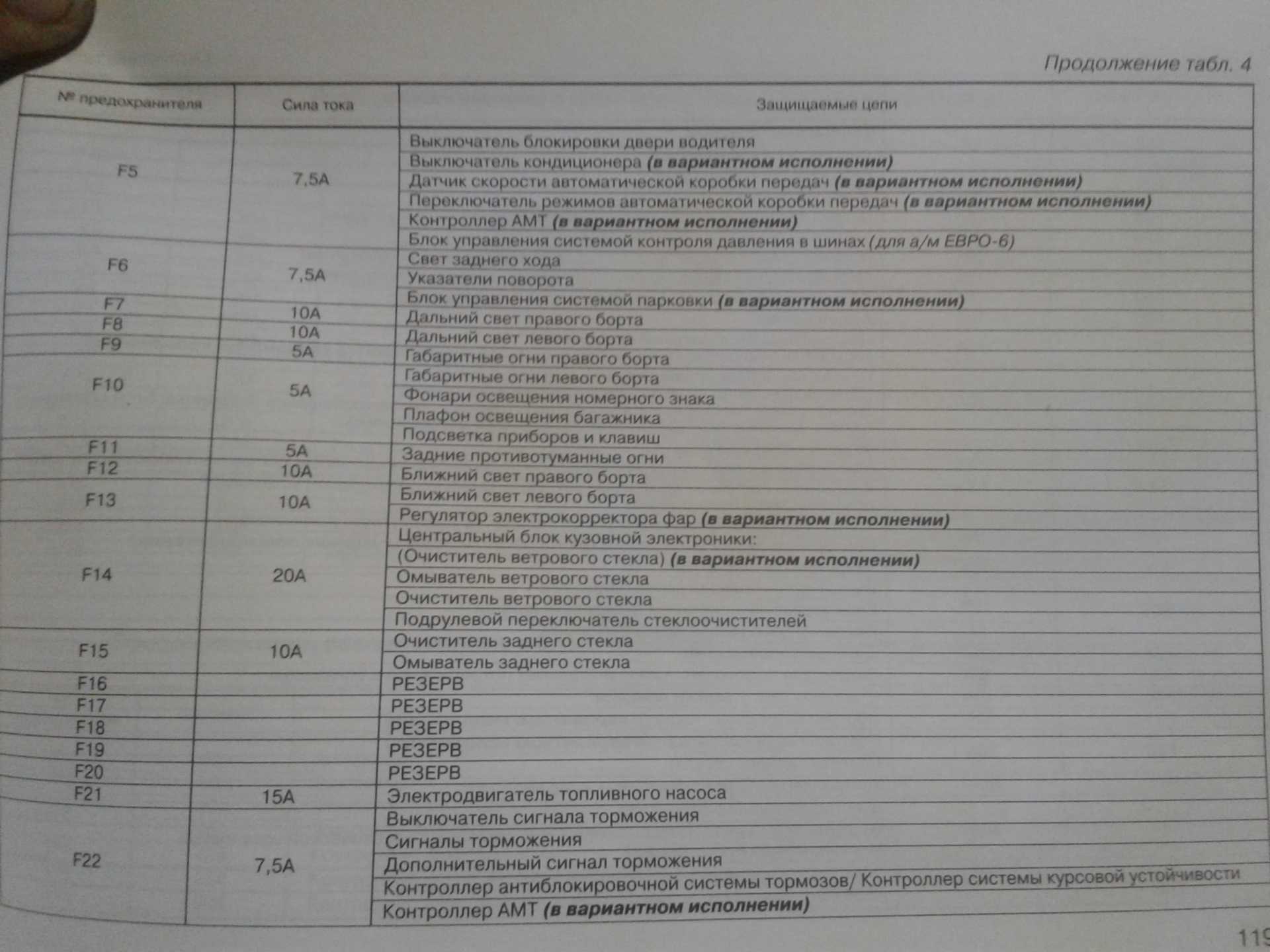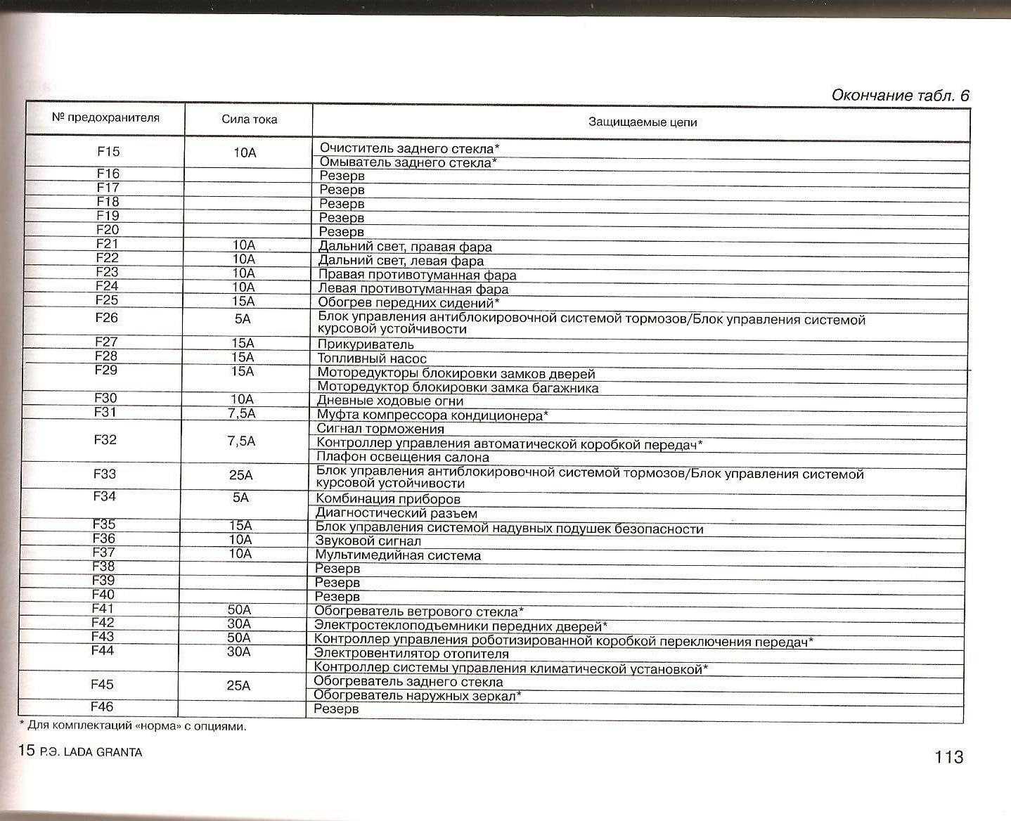 № предохранителя Сила тока, А Защищаемые электрические цепиF1 15 Контроллер, реле вентилятора охлаждения двигателя, КЗ 2х2, форсункиF2 30 СтеклоподъемникиF3 15 Аварийный сигналF4 20 Стеклоочиститель, НПБF5 7.5 15 клеммаF6 7.5 Свет заднего ходаF7 7.5 Клапан адсорбера, ДМРВ, ДК1/2, датчик скоростиF8 30 Обогрев заднего стеклаF9 5 Габаритный огонь правыйF10 5 Габаритный огонь левыйF11 5 Задний противотуманный огоньF12 7.5 Ближний свет правыйF13 7.5 Ближний свет левыйF14 10 Дальний свет правыйF15 10 Дальний свет левыйF16 — —F17 — —F18 — —F19 — —F20 15 Звуковой сигнал, замок багажника, КП, прикуриватель, диагностический разъемF21 15 БензонасосF22 15 Центральный замокF23 10 ДХОF24 — —F25 10 Плафон освещения салона, стоп-сигналF26 — —F27 — —F28 — —F29 — —F30 — —F31 — —F32 30 Отопитель, ЭУР