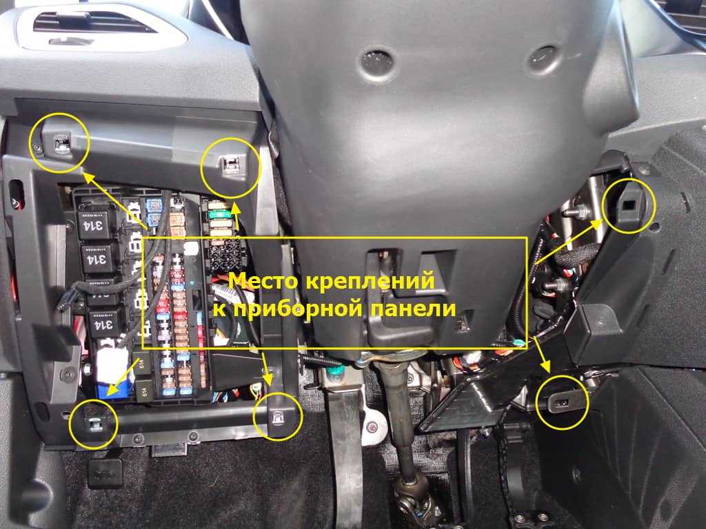 Этот монтажный блок расположен в привычном для водителей месте – возле левой ноги. Собственно, пространство вокруг кнопки открывания багажника и регулировщика света фар является крышкой монтажного блока.