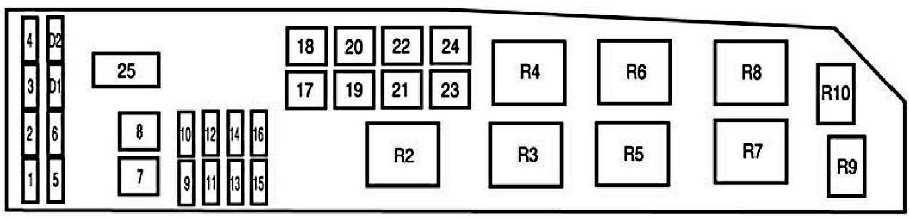 | 3 | 25A High beam headlights, direction indicators, interior lighting, headlights |