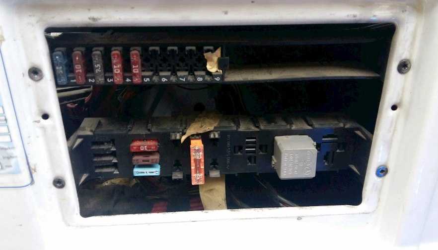 Under the panel is where the first fuse and relay box is mounted. Remove the protective cover to gain access.
