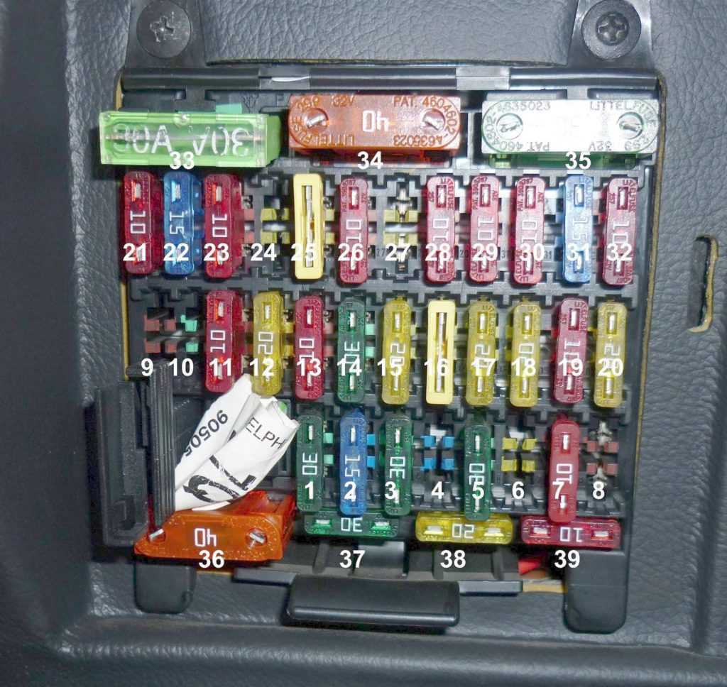 Главный БП транспортного средства модели Б находится там же, где и в модели А: с водительской стороны под торпедой, слева от рулевого колеса. Чтобы добраться до него, вам потребуется снять пластиковую накладку. На каждой отдельно взятом звене можно увидеть цифру — она обозначает величину пропускаемого тока. Далее предлагаем вам ознакомиться со схемой.