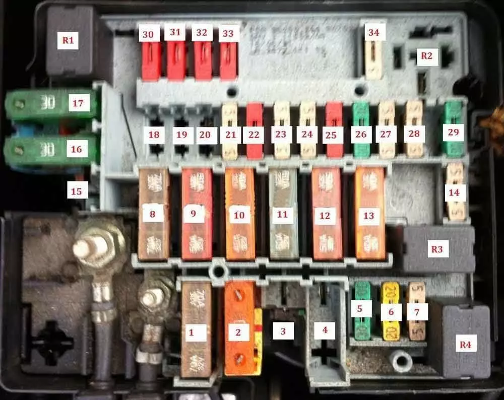 - 30 A Кислородный датчик, цепь электропитания инжекторов, электроклапаны абсорбера, электроклапан системы распределения и рециркуляции отработавших газов (на бензиновых версиях), ТНВД (на дизельных версиях).