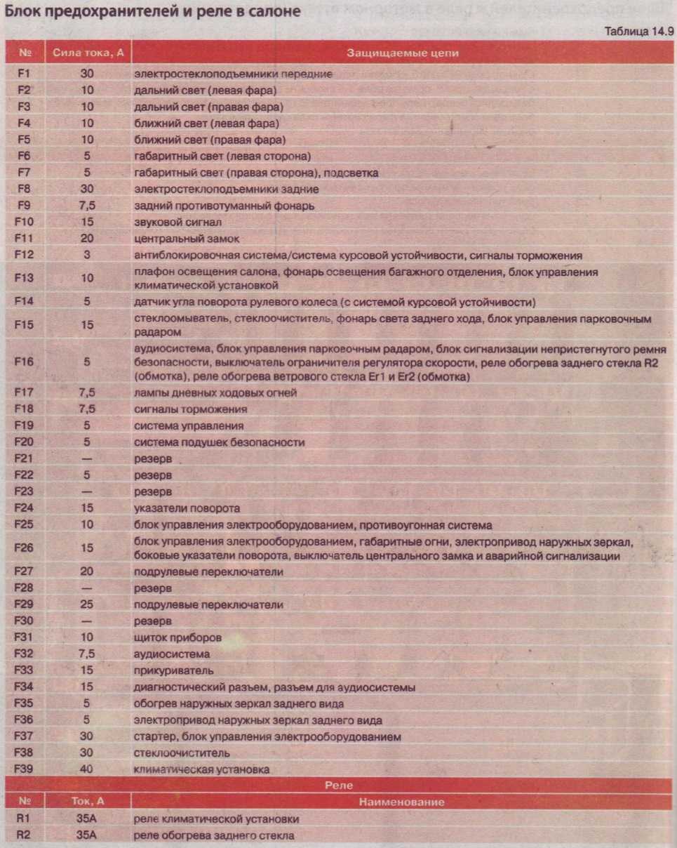 | F13 (30A) и F14 (30A) | Цепи электро стеклоподъемников задних и передних дверей соответственно |