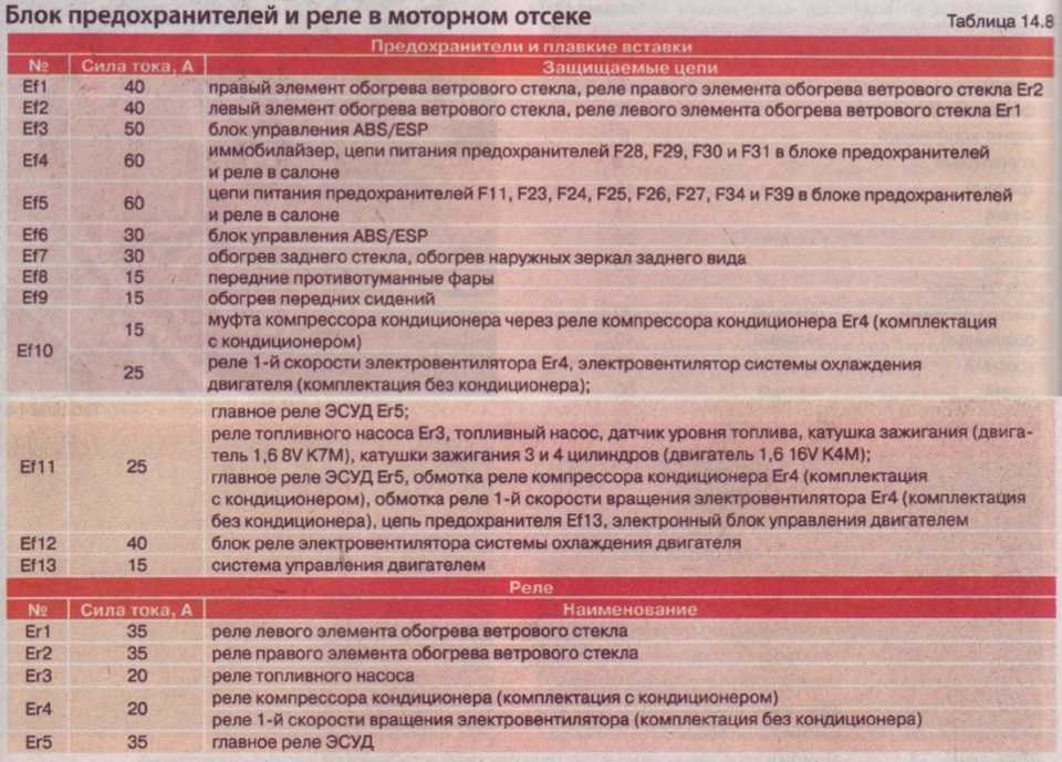 | Ef11 | 25 | главное реле ЭСУД Er5;реле топливного насоса Er3, топливный насос, датчик уровня топлива, катушка зажигания (двигатель 1,6 8V К7М), катушки зажигания 3 и 4 цилиндров (двигатель 1,6 16V К4М); главное реле ЭСУД Er5, обмотка реле компрессора кондиционера Er4 (комплектация с кондиционером), обмотка реле 1-й скорости вращения электровентилятора Ег4 (комплектация без кондиционере), цепь предохранителя Ef 13, электронный блок управления двигателем |