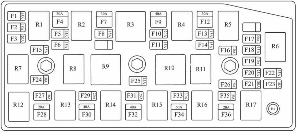 Схема расположения предохранителей в монтажном блоке, который находится под капотом Каптива: