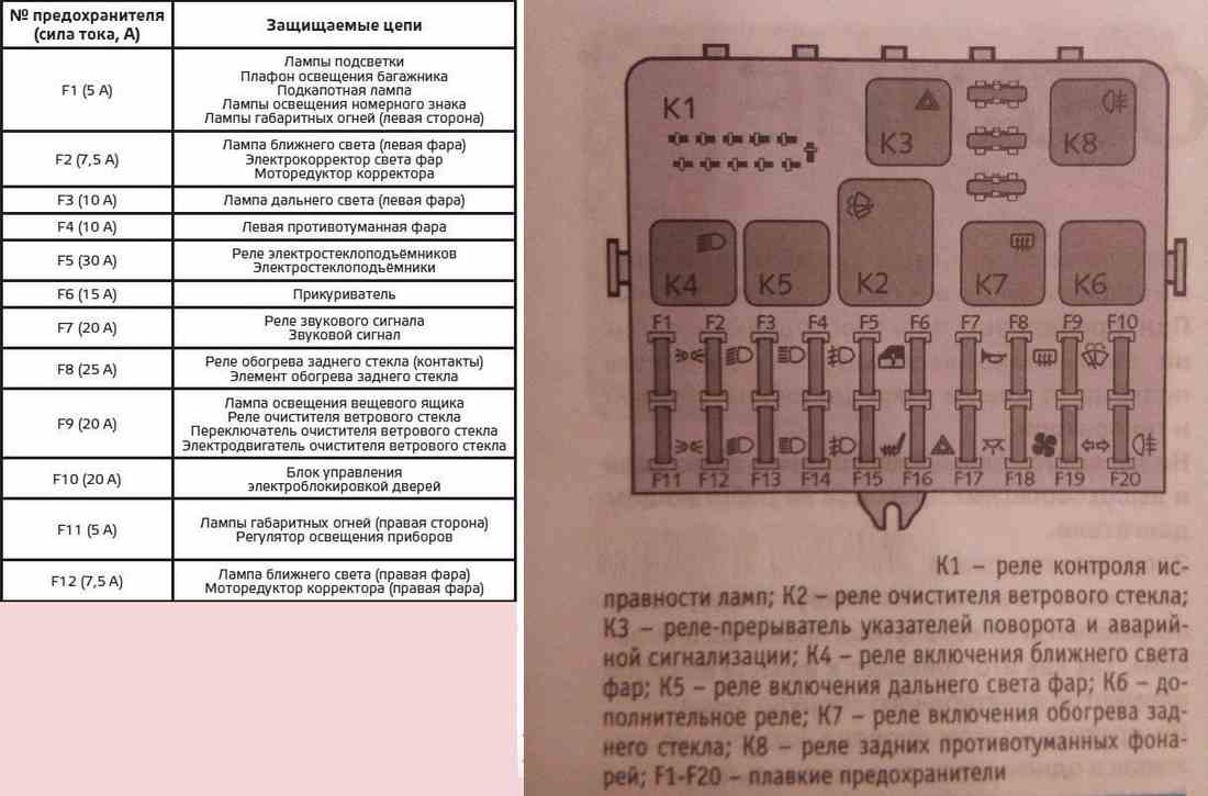 Ниже представлена таблица, в которой указано, какой предохранитель за какое электрооборудование отвечает.