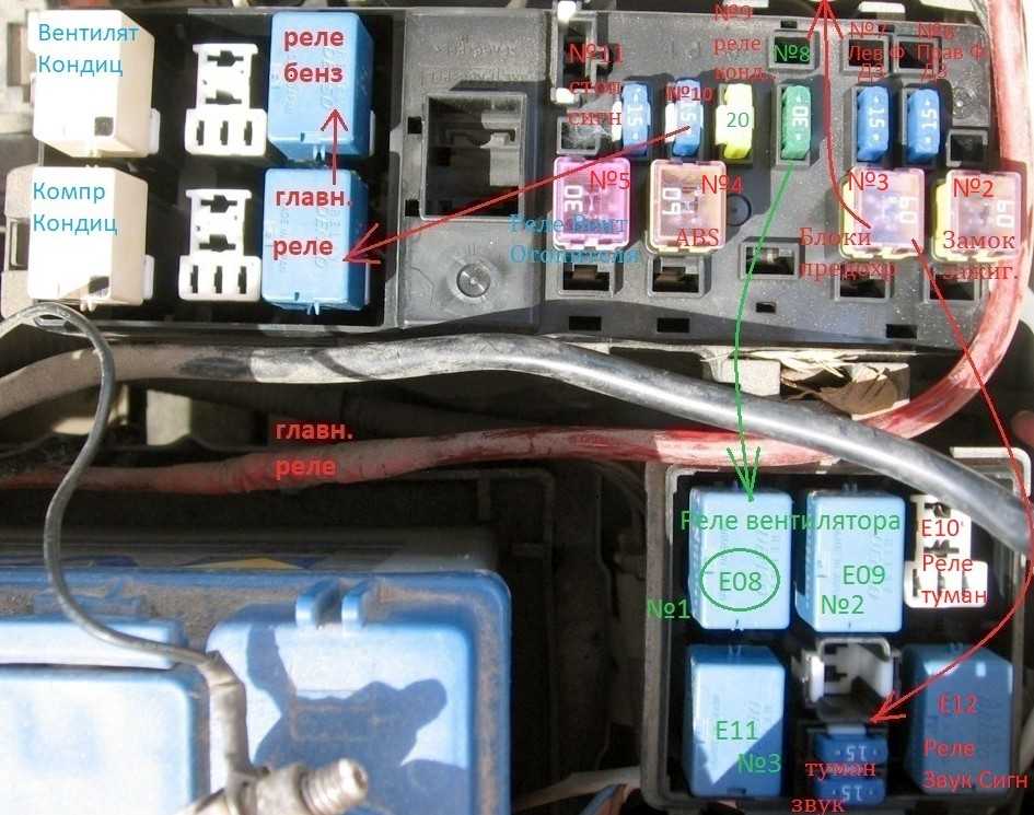 12 10А Реле компрессора, Реле вентилятора кондиционера, Переключатель обогрева зеркал , Реле мотора вентилятора, Реле мотора вентилятора (Hi) 13 15А Подогрев сиденья 14 20А Переключатель обогрева заднего стекла (универсал) либо Реле обогрева заднего стекла 15 15А ECM, Коннектор передачи данных, Комбинация приборов, Точечные светильники, Салонный свет, Освещение багажника, Магнитола, TCM 16 10А Задний противотуманный фонарь, Переключатель заднего противотуманного фонаря, Контроллер заднего противотуманного фонаря 17 10А Аварийная сигнализация 18 15А Резерв 19 10А Реле H/T ( Headlight/ Tail) либо Габариты (Tail), подсветка приборов и номерных знаков 20 20А Центральный замок 21 Резерв 22 15А Электронный блок управления SRS 23 15А Генератор, Катушки зажигания 24 10А Контроллер дверных замков, Переключатель аварийного света, Резервный переключатель света, Датчик переключения передач, Режим рукоятки, Переключатель управления режимами 25 15А Стеклоочистители, Мотор лобового дворника, Привод положения передних фар (L), Привод положения передних фар (R), Переключатель положения фар, Комбинация переключателей, Реле заднего дворник, Мотор заднего дворника 26 10А Электронный блок управления ABS 27 10А Комбинация приборов 28 15А Предохранитель прикуривателя, Питание переключателя зеркала, Магнитола, Антенный усилитель 29 15А Разъем питания дополнительного оборудования