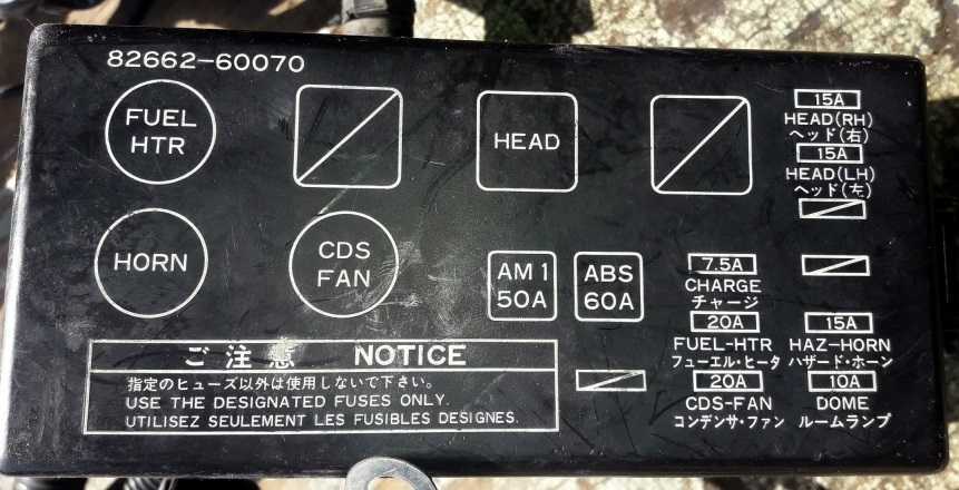 | 11 | 50A AM 1 – All components in the CIG, WIPER, GAUGE, TURN, ECU-IG, REAR-HTR, IGN, DIFF and FL POWER circuits |