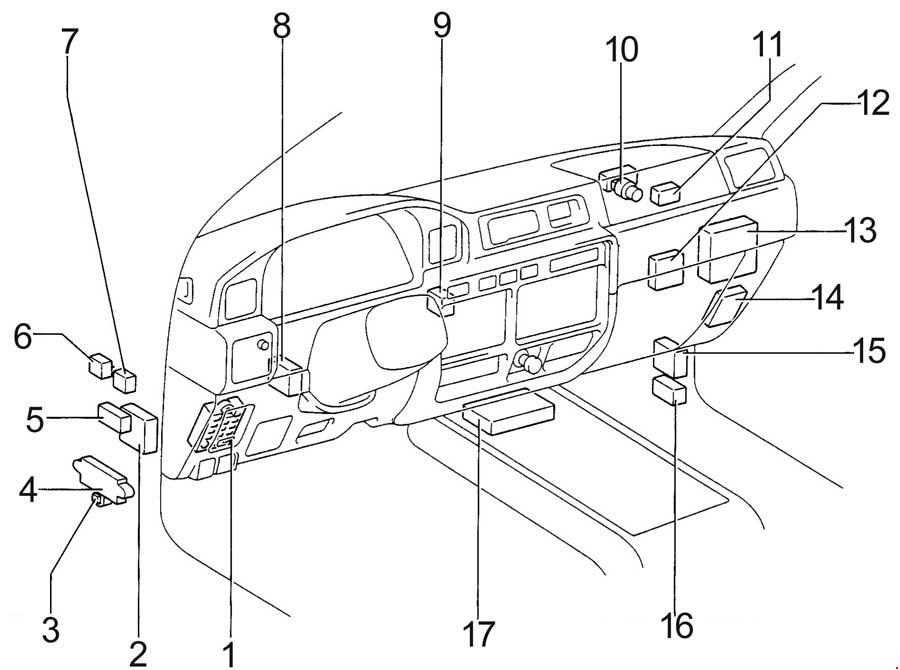 Общая схема расположения монтажных и электронных блоков в салоне Toyota Land Cruiser Prado 90 / 95 (1996-2002)