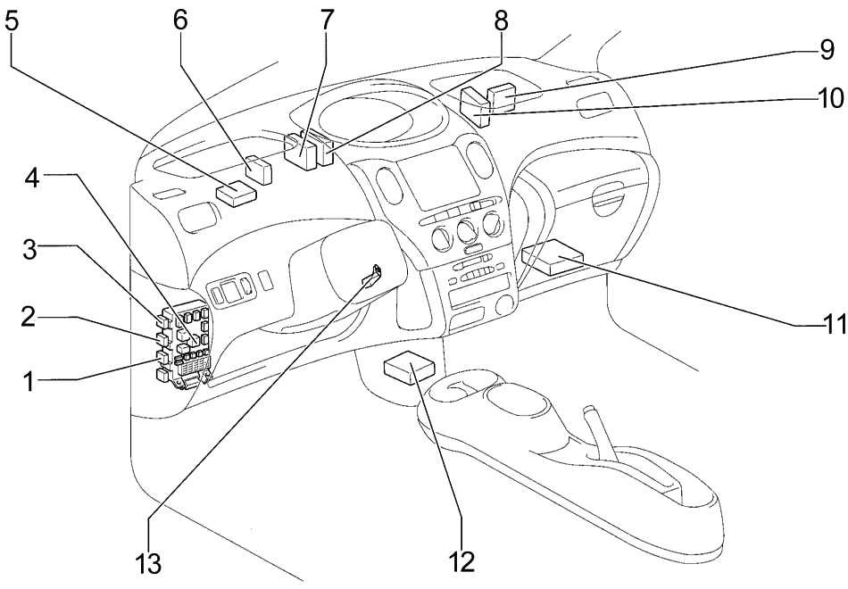 1 — реле омывателя фар, 2 — блок реле №7, 3 — блок реле №3, 4 — блок реле №5, 5 — блок реле и предохранителей в моторном отсеке, 6 — блок плавких вставок, 7 — реле системы освещения в дневное время, 8 — центральный монтажный блок, 9 — усилитель кондиционера (с ручным управлением), 10 — блок реле №4, 11 — усилитель кондиционера (автоматический кондиционер), 12 — реле топливного насоса, 13 — блок управления двигателем (модели с МКПП), блок управления двигателем и АКПП (модели с АКПП), 14 — центральный датчик системы SRS, 15 — блок управления иммобилайзером, 16 — блок управления дистанционным замком, 17 — интегрированное реле, 18 — реле обогревателей сидений, 19 — блок предохранителей, 20 — реле передних противотуманных фар, 21 — блок реле №1 (сторона водителя), 22 — реле обогревателя заднего стекла, 23 — блок реле и предохранителей в салоне.
