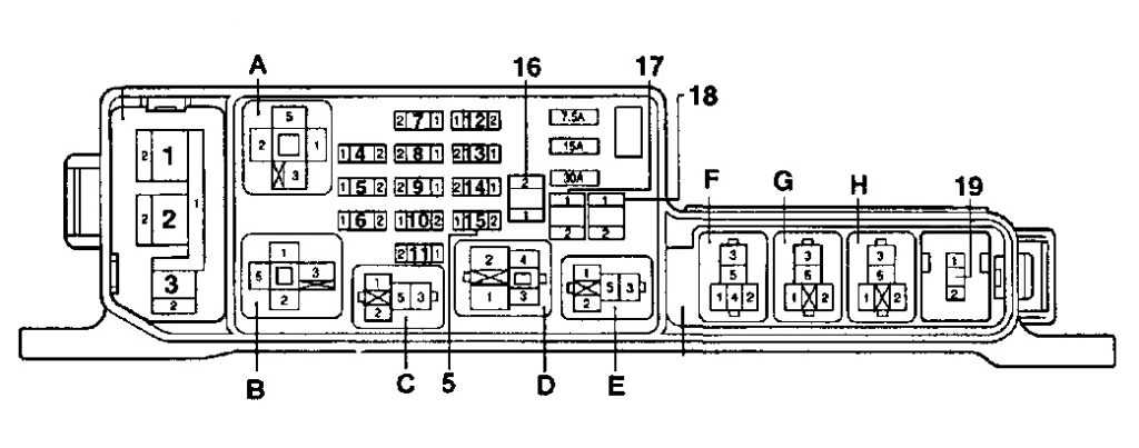 4 – DOME 7,5A, Interior lighting 5 – HEAD RH 15A, Headlight right side 6 – ECU-B 10A, Airbag System (SRS), Anti Lock Brake System 7 – AM2 20A, Ignition lock 8 – RADIO 10A, Radio and audio system 9 – jumper, 10 – HEAD LH 15A, Headlight left side 11 – HORN 10A, Signal 12 – ALT-S 5A, Generator 13 – POWER 2 30A, 14 – HAZARD 10A, Alarm 15 – EFI 15A (3S-FSE 20A), Electronic engine control unit 16 – FAN SUB 30A (40A diesel models), Cooling fan 17 – FAN MAIN 40A (50A diesel models), Cooling fan 18 – MAIN 50A, Main fuse 19 – EFI No. 2 25A (only 3S-FSE), Electronic engine control unit |