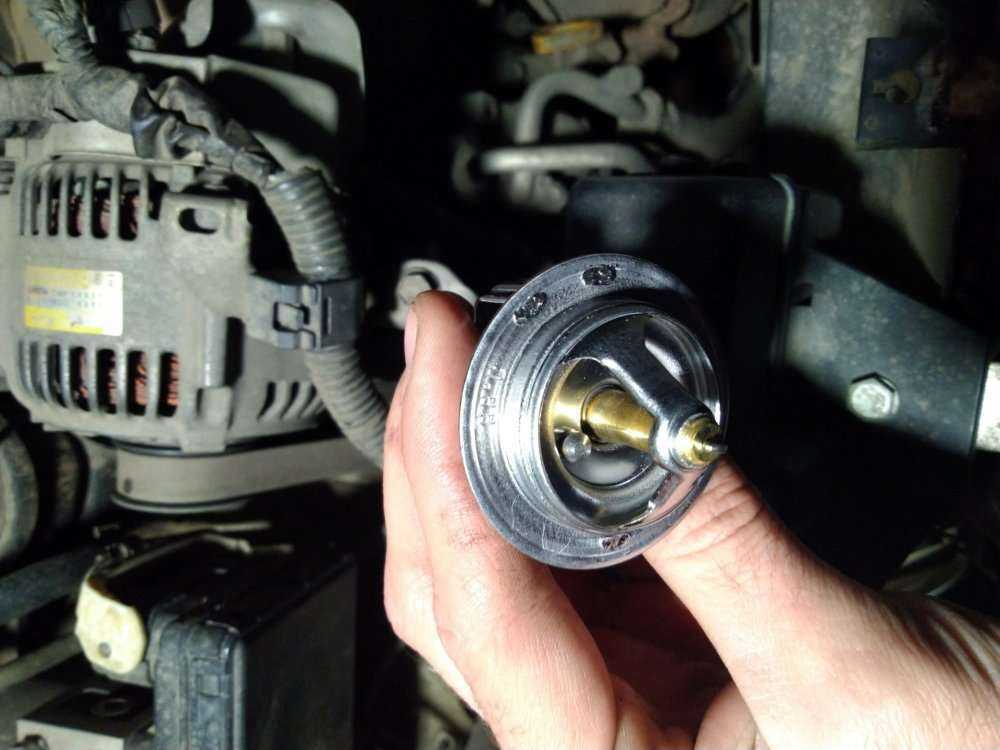 Этот элемент отвечает за пуск жидкости охлаждения (антифриза) по малому и большому кругу. Если на большой скорости печка начинает дуть холодным или едва тёплым воздухом, но ни низких скоростях всё нормально, термостат заклинило в открытом положении, и антифриз идёт по большому кругу. Из-за этого радиатор печки недостаточно прогревается и не отдаёт тепло в салон. При заклинивании на малом круге печка будет работать хорошо, но двигатель быстро перегреется.